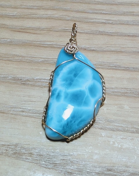 「商品説明」 美しい青のラリマーをオリジナルのワイヤーワークでペンダントに仕立てました。ワイヤーはK14ゴールドフィルドワイヤーを用いてます。大変耐久性あるワイヤーですので、金製品と同じように使えます。 |