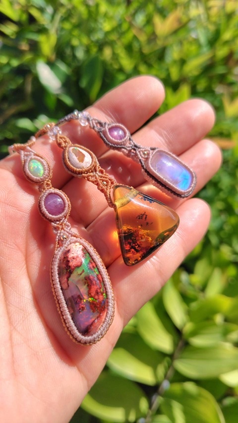 | 「お店の紹介」 世界中で集めた天然石をマクラメ編みの技術で編み込んだ作品を制作。地球の欠片から受け取るインスピレーションを大切に、一つ一つ真心込めて制作しています。 |