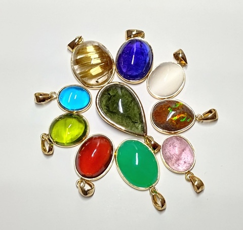 | 「商品PR」 K18 ペンダントトップ 色々な石種のカボション 時計回りに タンザナイト、ムーンストーン、オパール、 トルマリン、クリソプレーズ、ガーネット、 ペリドット、ブルートパーズ、ルチル、 中央がモルダバイトです。 |