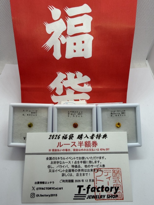 | 「商品PR」 恒例の福袋!!今年もやります!! 恒例のルース半額券ももちろん同封します!! 更に今年は1/3の確率でシークレットチケット同封します!! お楽しみに〜!! |