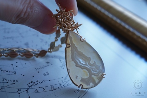 | 「商品PR」 【2/28 新作】透明感のある薄橙色が美しい、パイプアゲートのペンダントトップです。 光に透かしたり、濃い色の服と合わせると、白い炎のような模様が出現。 パイプアゲートの中心に空いた穴の縁に見える、極小の結晶も見どころです |